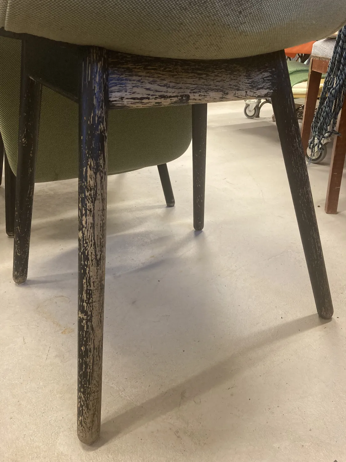 De 14 stolarna med underrede av trä var ordentligt slitna och målades om i svart färg. Samtliga 20 stolar plockades isär för att kunna byta tyg och stoppning. Innan allt gammalt material togs bort och källsorterades kunde originaltyget användas som mall till ny klädsel. Alla stolar fick ny stoppning. Resultatet blev fantastiskt och stolarna är som nya igen 💚