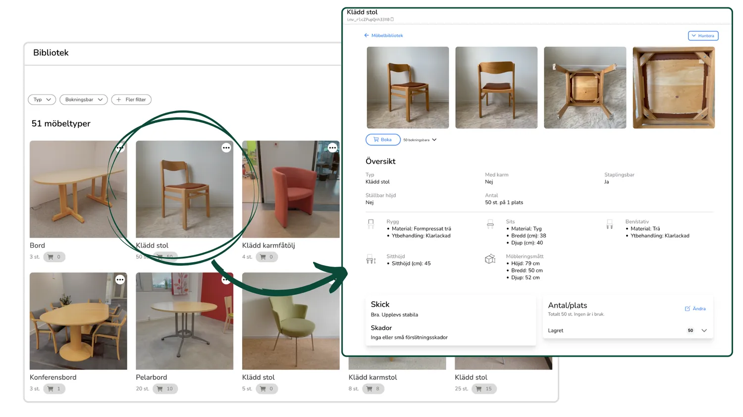 De publika möbellänkarna gör att mottagaren av ert underlag enkelt kan klicka sig vidare och se all relevant information om de möbler som ingår i respektive möbeltyp – direkt i plattformen. Detta ger en tydlig och komplett bild för de leverantörer ni vill be om en offert från gällande möbelrekonditionering.