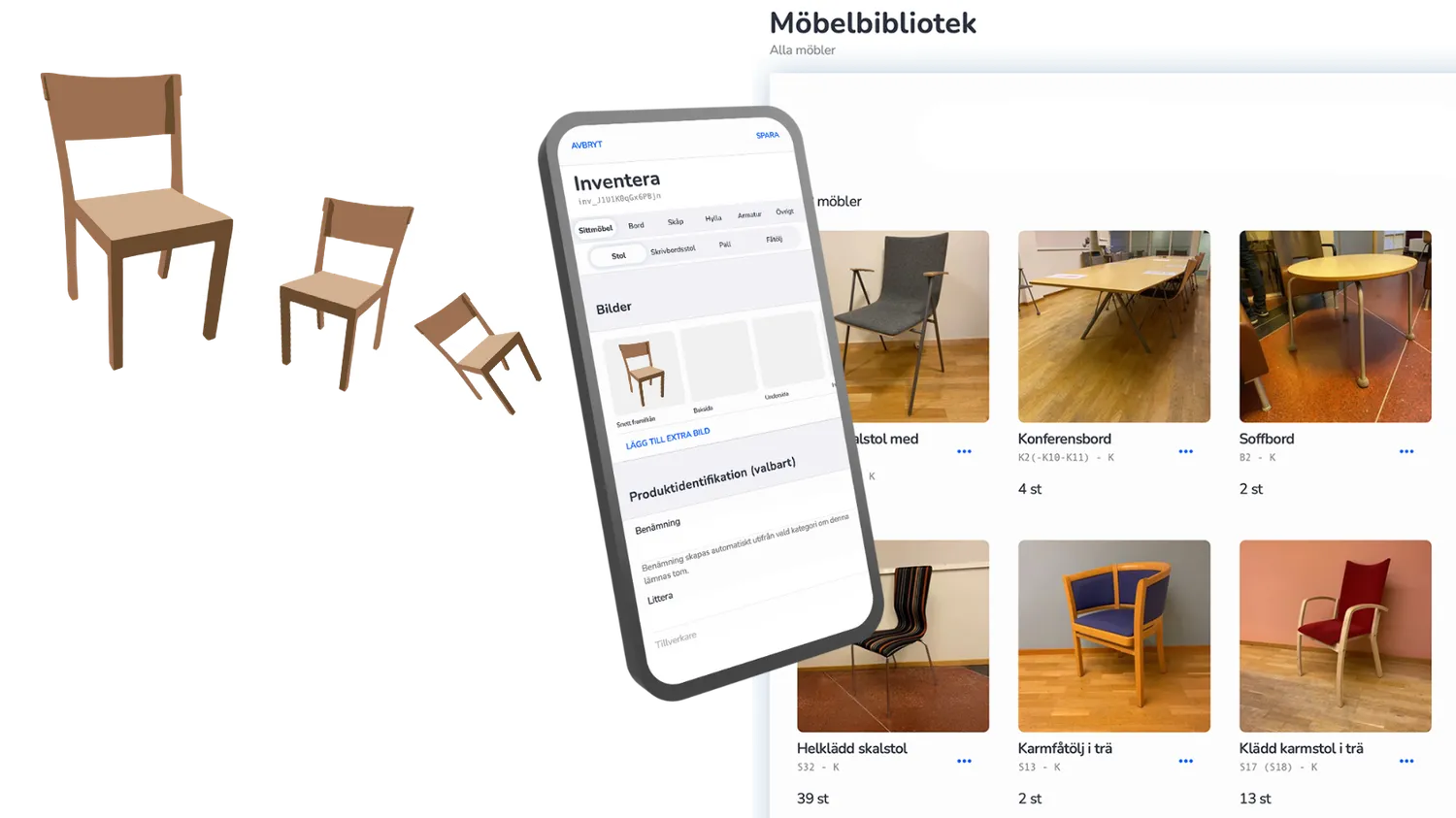 Först inventeras alla möbler i projektet, om de inte redan finns i ert digitala möbelbibliotek. Inventeringen görs enkelt via mobiltelefonen, där systemet hjälper er att effektivt gruppera och specificera antalet möbler av samma modell. All denna information registreras sedan smidigt i plattformen – ovärderligt oavsett om ni ska flytta möbler internt, behöver överblick över ert befintliga möbelinnehav eller ska genomföra möbelrekonditionering vid en lokalförändring.